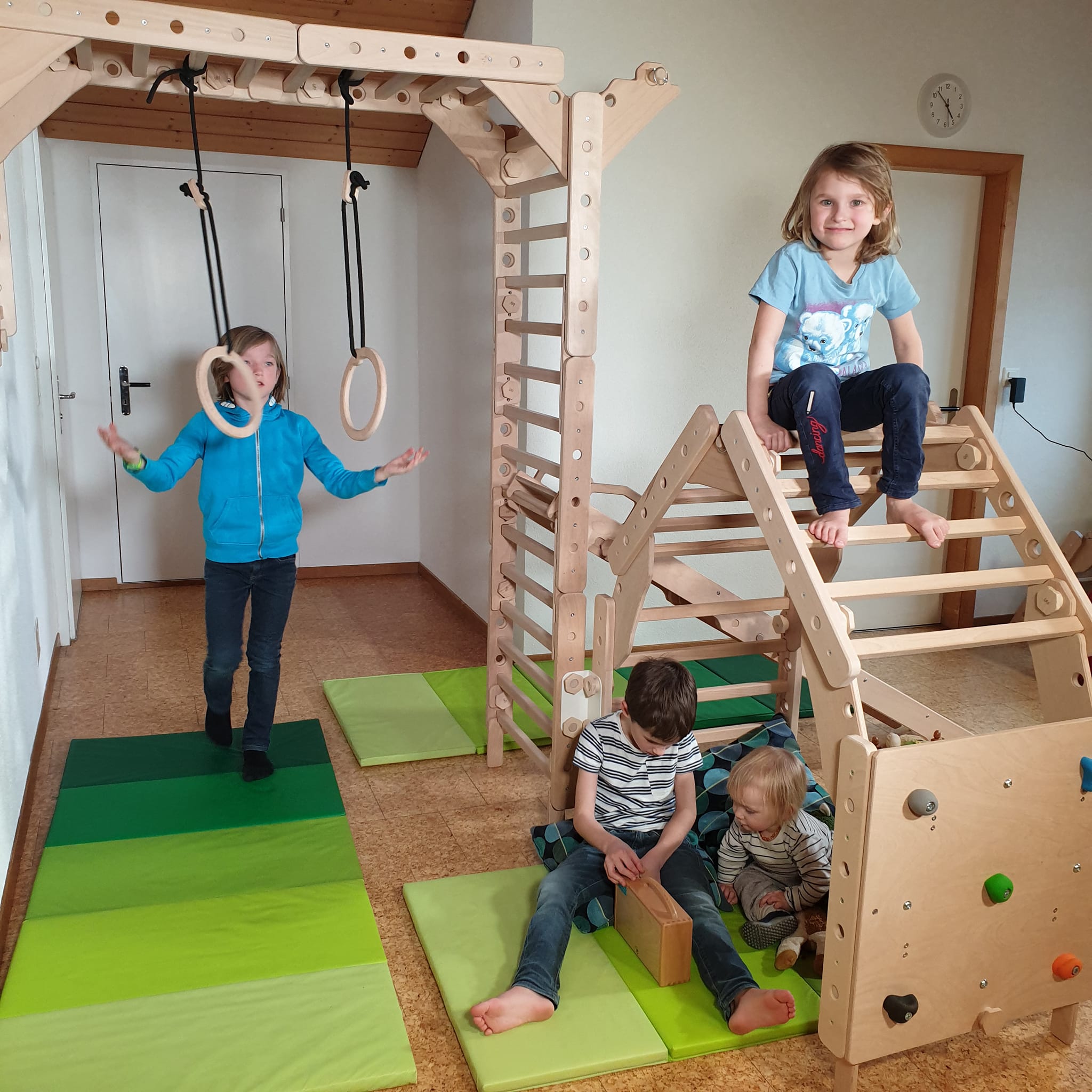 Mit den von uns ausgewählten Basisbauteilen hast du sehr viele Möglichkeiten Bauten für dein Kind zu bauen. Für die Kleinsten kannst du sehr niedrig bauen, Bauten die auch kriechend zu erklimmen sind. Für grössere Kinder ist die Brücke, das Häuschen, das gross Kletterdreieck wunderbare Bauten zum Klettern und auch für Rollenspiele. Mit diesem Set hast du die Möglichkeit, entweder mehrere Bauten gleichzeitig oder aber grosse Bauten wie das Häuschen mit Vorbau oder ein Doppelhaus sowie coole Sprossenwandelemente zu bauen.